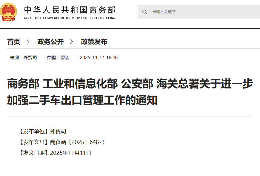 China’s Ministry of Commerce, along with three other key government bodies, has released a new policy to strengthen the management of used car exports. The notice, issued on November 11, 2025, aims to standardize export practices, curb illegal activities, and support the healthy development of China’s automotive export industry.